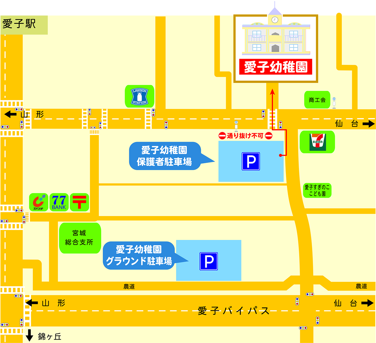 稚園グラウンドの駐車場は、愛子バイパス沿いにあり、交差点を右折や左折をしてすぐに左に入る側道があります。