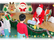 ホールで各クラスの代表のおともだちがサンタさんからプレゼントを受け取りました。お部屋に戻るとプレゼントをもらってみんな大喜び!